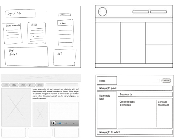 Mostre-lhes algumas imagens de wireframe, faça com que observem as linhas simples que mostram a colocação de elementos numa página web. Lembre-os de que o wireframe é só o esqueleto, ou seja, a organização do espaço, pois é na elaboração do layout que serão definidas as imagens e cores.